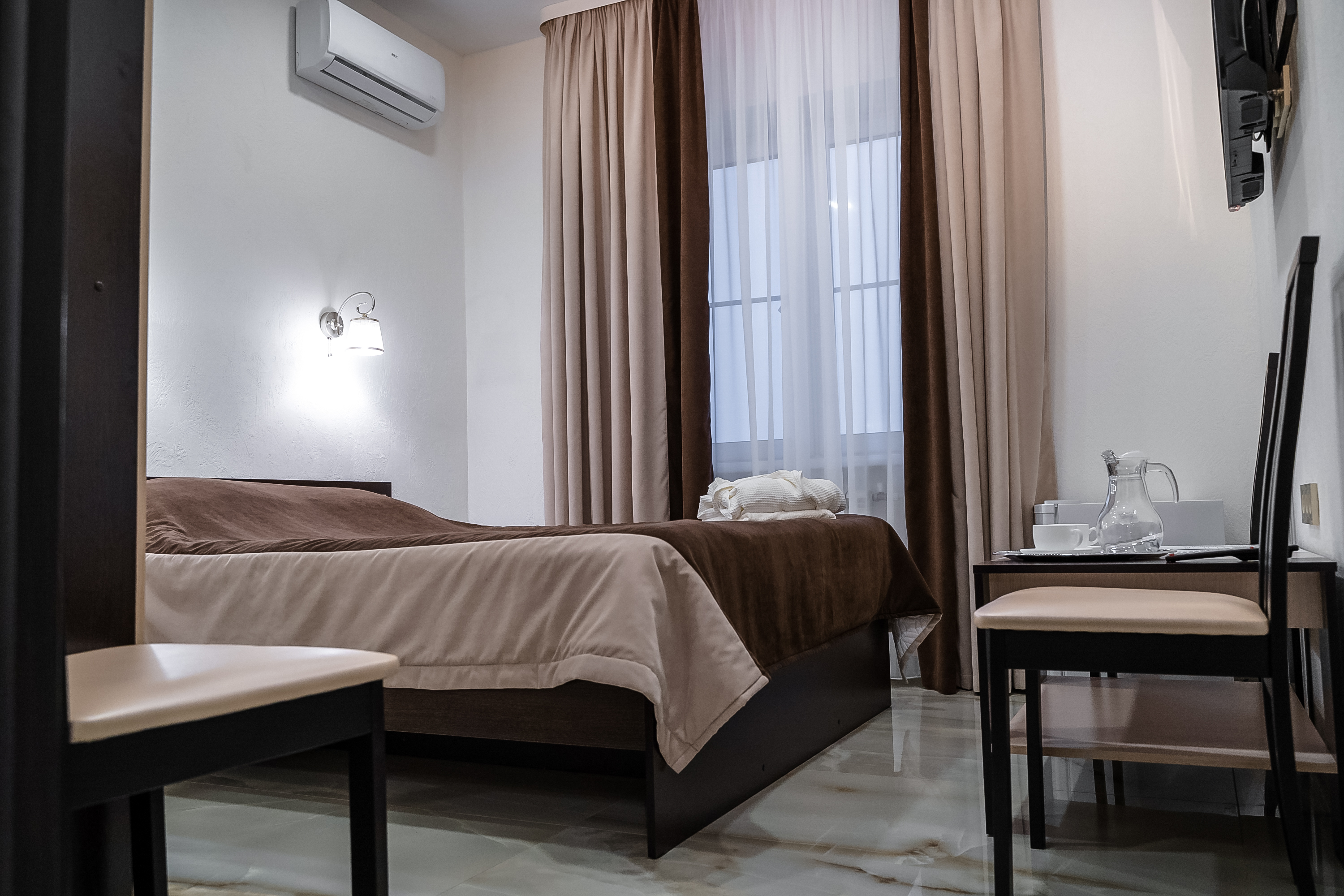 Классический однокомнатный номер стандартной категории. В номере имеется одна двуспальная кровать, шкаф, 2 тумбочки, холодильник, кондиционер, журнальный стол, ж/к телевизор, Wi-Fi доступ в интернет, туалет, душ, туалетные принадлежности, набор полотенец. Пользование феном – по запросу. Размещение - 2 человека на основных местах
